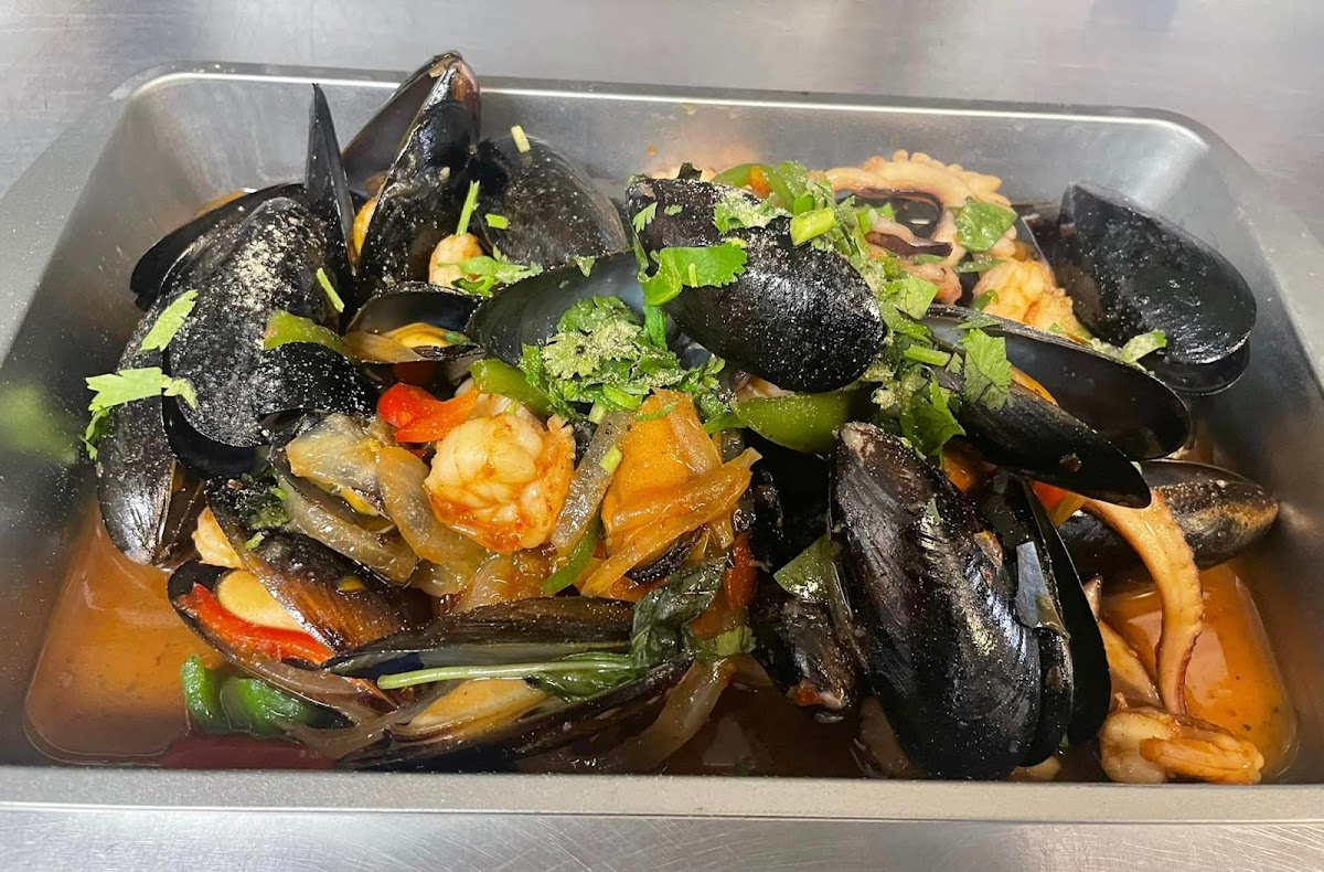 Mussels, octopus and shrimp. Onion, bell peppers, green onion, cilantro thai sweet basil in house sauce.