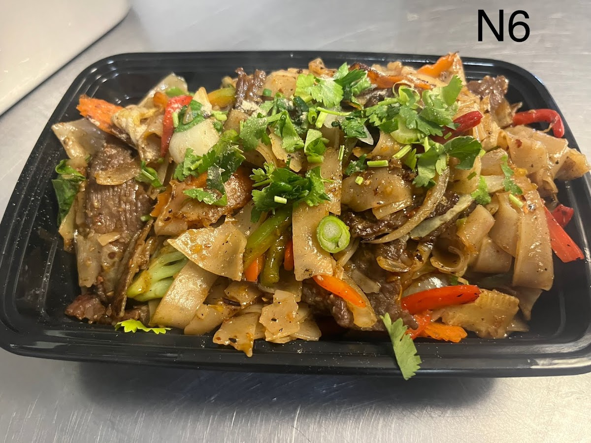 Flat rice noodles, broccoli, carrots, mushrooms, bell peppers and thai basil with thai basil sauce topped with Green Onions and cilantro.